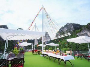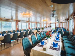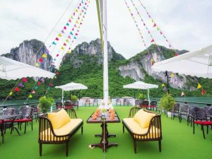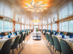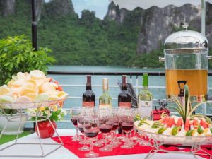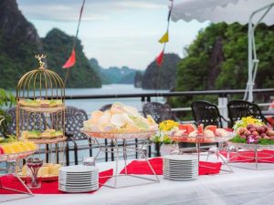 12:30: Enjoy a Vietnamese lunch on the boat. While having lunch, the boat will pass by beautiful scenery on both sides with thousands of limestone formations, such as Fighting Chicken and Incense Burner Islets – two symbols of Halong Bay.