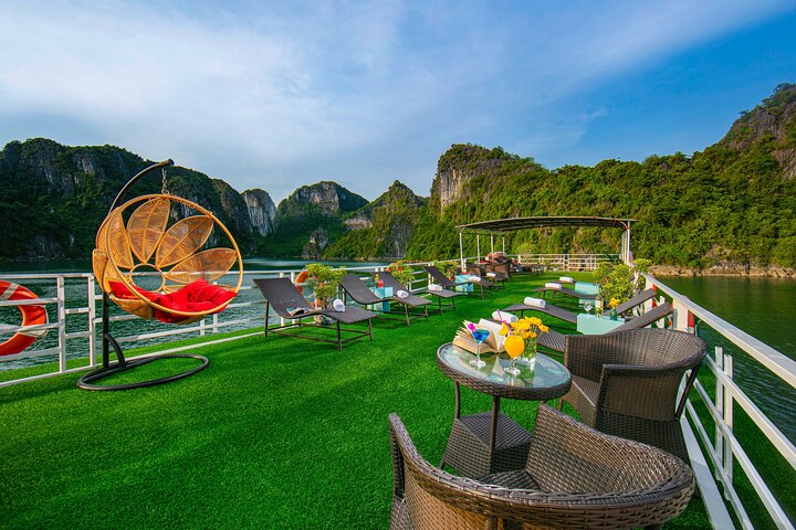 Embark on an unforgettable adventure through Ha Long Bay and Lan Ha Bay aboard the cruise. Enjoy a buffet lunch, kayaking, and swimming at Tra Bau fishing village. Relax during a sunset party and join a Vietnamese cooking class before a romantic dinner.