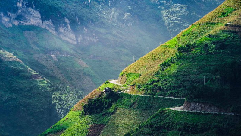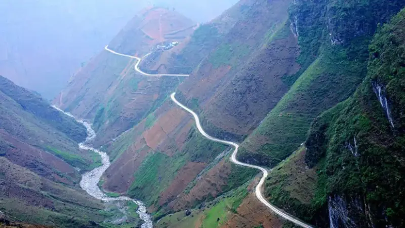 At the highest point of the pass, a well-known viewpoint offers travelers a perfect place to stop and take in the stunning scenery. From here, you can see straight down into the Tu San Abyss — Southeast Asia’s deepest canyon — with the emerald-green Nho Que River snaking far below. Early mornings often bring a layer of mist that adds to the drama of the landscape.